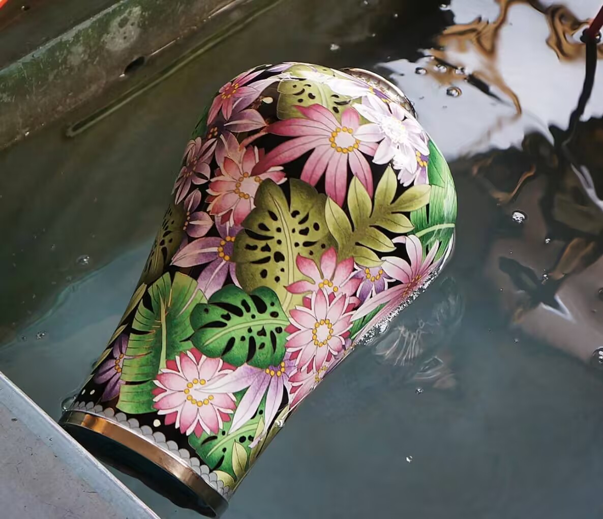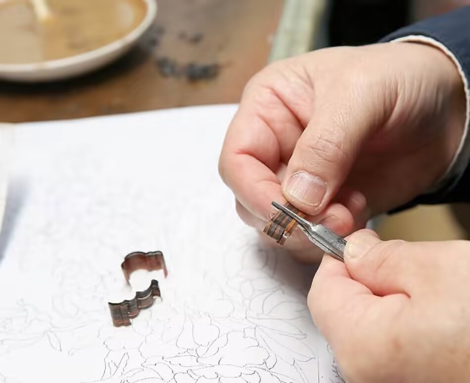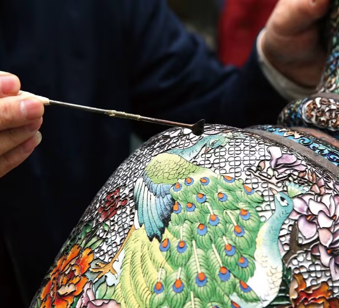 铜胎制成后,师傅们先将设计好的图样画到铜胎上,再将事先做好的铜丝(通常0.3~0.5mm)按照图案用镊子徒手弯曲成花纹,误差需控制在0.1mm内,否则烧制后会断裂或变形,这个过程叫做掐丝。然后用镊子夹着折好的铜丝,沾上点儿白芨,严丝合缝地粘在铜胎的图案上,因白芨遇火既化,还需要在粘满铜丝的铜胎上筛一层银焊药粉,放在火里经900多度的焙烧,铜丝就牢固粘在铜胎上了。