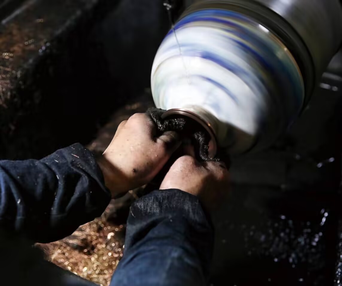 烧完蓝后,景泰蓝表面的釉料薄厚不均,要将其磨平,使掐上的丝显露出来,这个步骤被称为磨光。制作师傅将待打磨的成品套在转轮上,先用粗砂石和细砂石将釉面磨平,再用黄石、椴木细磨,直到磨出景泰蓝特有的光亮。