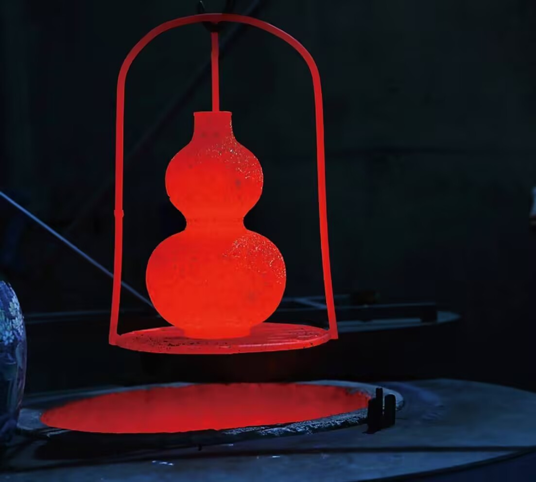 点蓝后还要进行烧制,即“烧蓝”。每个景泰蓝都至少要烧结三次,一火要与丝平,二火要高于丝,三火则与丝找平,每烧一火就要用清水洗净蓝胎、烤干,点一次蓝就要烧一次。由于各种颜色釉质所含金属元素不同,熔点也不同,如何控制好火中烧制的时间,全凭师傅眼力掌控。烧蓝时,铜胎通体红亮,冷却后又恢复到原有的色彩缤纷。