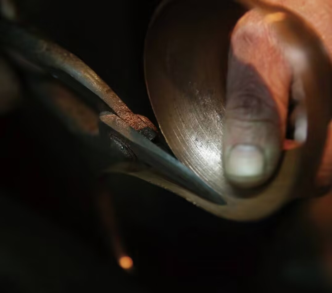 景泰蓝的造型是否有美感首先取决于制胎工艺,关键就是下料。下料指根据设计图纸,将金属板材(通常为紫铜或青铜)通过裁剪、切割等手法分解成特定形状的坯料。技师将不同规格型号的紫铜按照设计图的要求裁剪出不同形状,或是扇形,或为圆形,再用铁锤把它敲打成瓶、盘、碗、罐等各种形状的铜胎。整个过程都是手工制成。